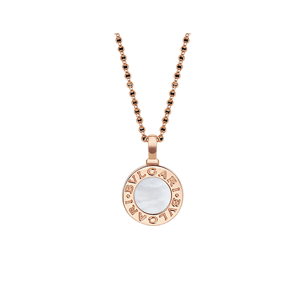 Bvlgari Bvlgari 18 kt rose gold circle pendant necklace with chain set with white mother-of-pearl insert, customizable with engraving on the back