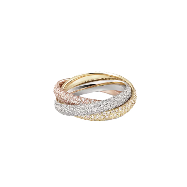 Trinity ring, medium model, 18K white gold (750/1000), 18K rose gold (750/1000), 18K yellow gold (750/1000), set with 468 brilliant-cut diamonds totaling 1.93 carats. Width: 3.2 mm (for size 52).