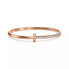 Wrapped around the wearer in a continuous, unbroken circle, this hinged bangle features scintillating diamonds and a strong “T” motif at the center. A reinvention of a Tiffany icon, Tiffany T1 designs represent individual strength and perpetual power, worn outwardly to express what lies within.