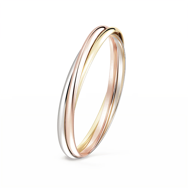 Trinity bracelet, classic model, 18K white gold (750/1000), 18K rose gold (750/1000), 18K yellow gold (750/1000). Width of one ring: 4.4 mm. Thickness of one ring: 2.0 mm